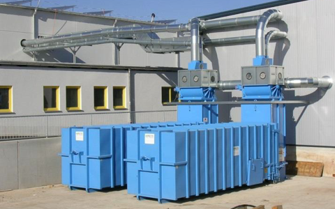- Presscontainer zur platzsparenden und automatischen Lagerung und Verdichtung der Partikel außerhalb des Gebäudes