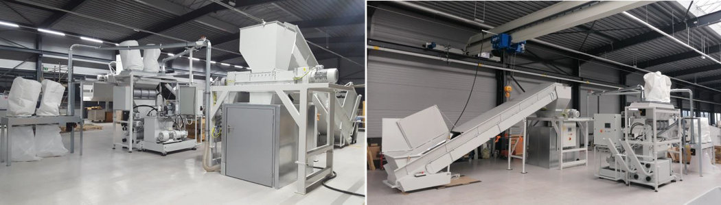 The main components of this system are a JBF 150/90 pre-shredder, two JBF DIS 100/60 disintegrators and 2 JBF AS 750/300 extraction systems. Plastic material up to pallets of 120 x 80 cm are fed into the pre-shredder via a wide conveyor belt. Pre-shredded 60mm wide strips are conveyed to a magnetic separator for automatic extraction of ferrous metals. The material flow is then divided into two lines, each equipped with a metal detector and a large disintegrator for further crushing of the shredded parts and an extraction system for transporting these particles to collection containers. Survive