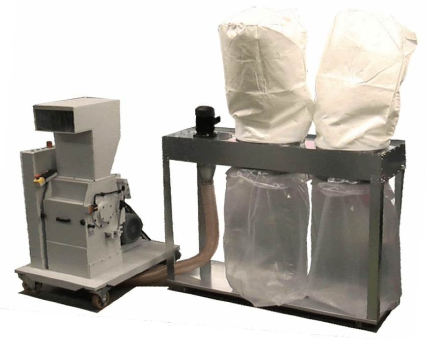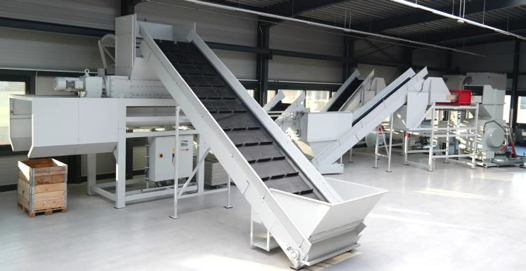 The main components of this system are a JBF 150/90 pre-shredder, two JBF DIS 100/60 disintegrators and 2 JBF AS 750/300 extraction systems. Plastic material up to pallets of 120 x 80 cm are fed into the pre-shredder via a wide conveyor belt. Pre-shredded 60mm wide strips are conveyed to a magnetic separator for automatic extraction of ferrous metals. The material flow is then divided into two lines, each equipped with a metal detector and a large disintegrator for further crushing of the shredded parts and an extraction system for transporting these particles to collection containers. Survive